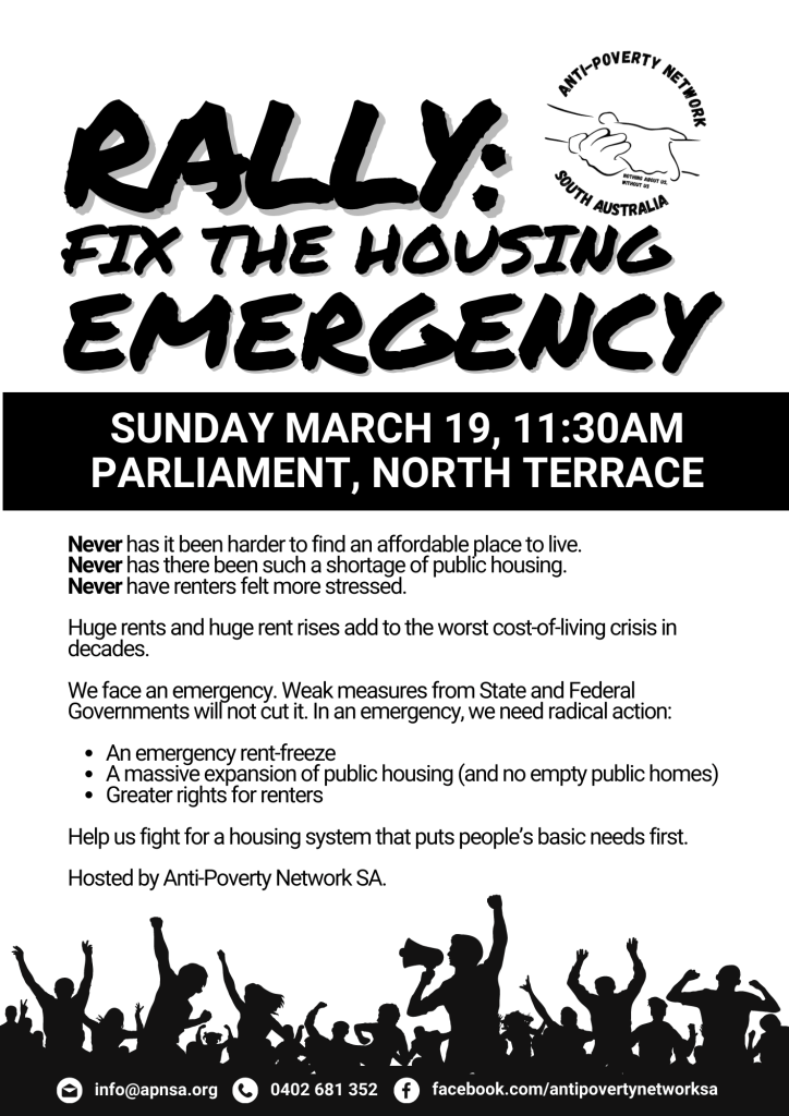 Join us outside Parliament, North Terrace, on Sunday March 19, 11:30am (1 year since the State Election), to call for urgent action on the housing emergency.