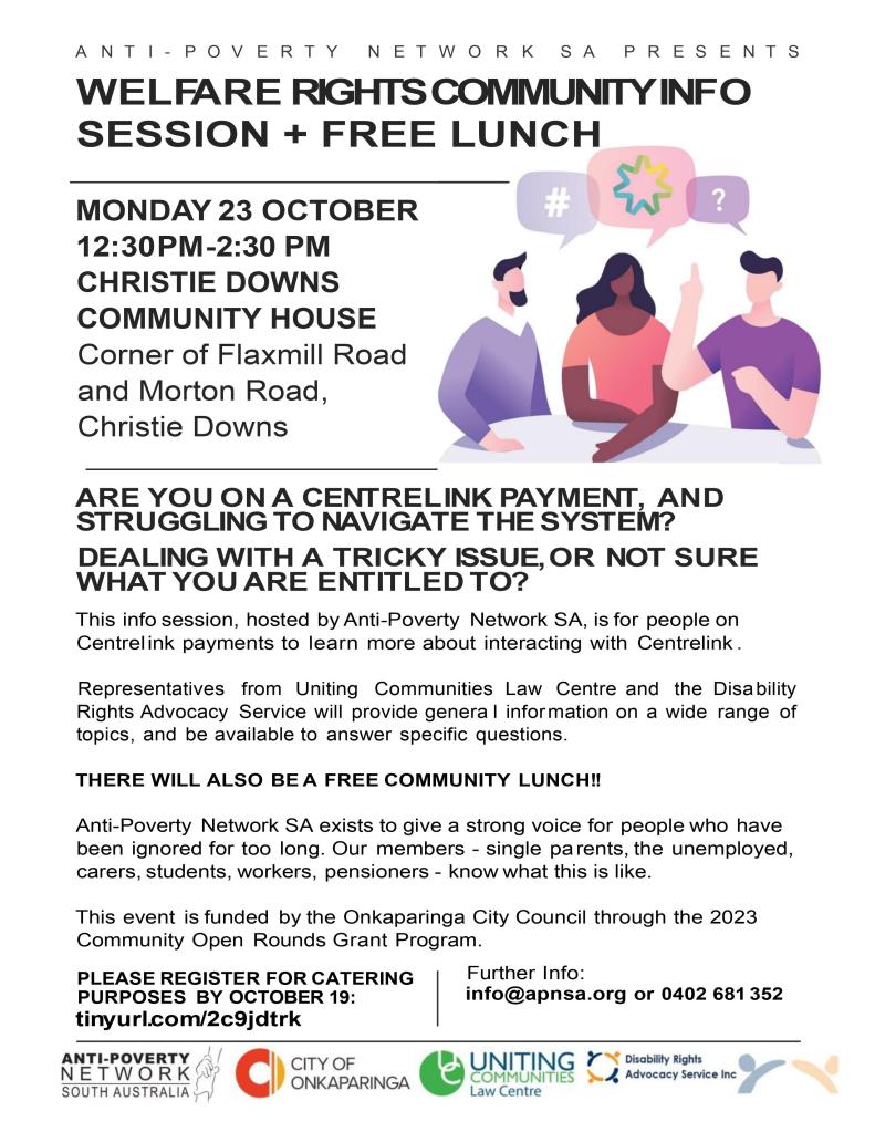 This info session, hosted by Anti-Poverty Network SA, is for people on Centrelink payments to learn more about interacting with Centrelink.