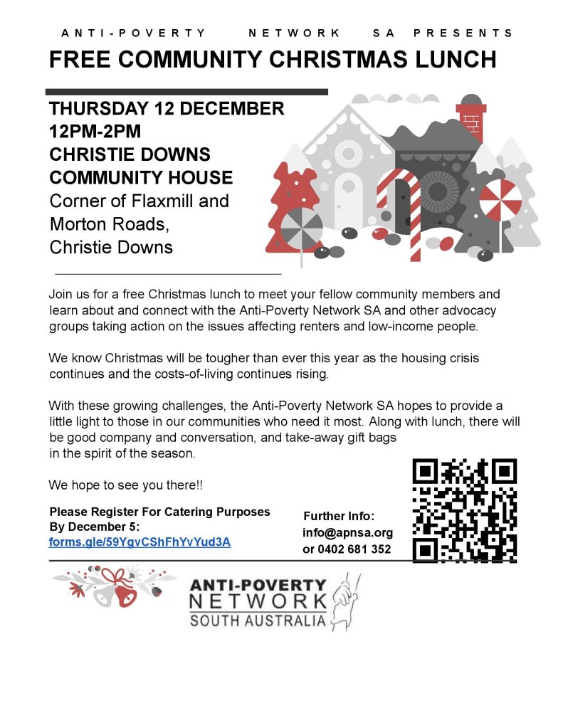 Join us for a free Christmas lunch to meet your fellow community members and learn about and connect with the Anti-Poverty Network SA and other advocacy groups taking action on the issues affecting renters and low-income people.