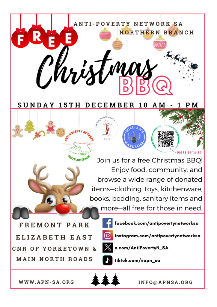 In collaboration with the Playford Women’s Shed and Williams Wardrobe, the Anti-Poverty Network Northern Suburbs ‘Free Christmas Community BBQ’ is n Sunday December 15, 10am-1pm, in Fremont Park, in Elizabeth.