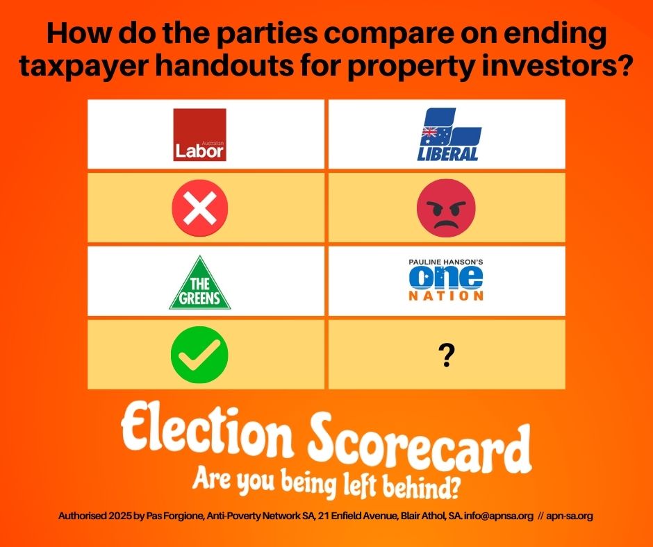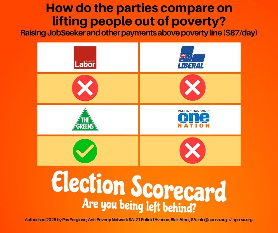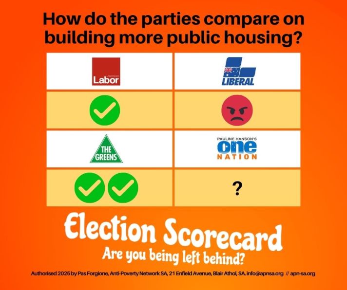 Every election, Anti-Poverty Network SA releases a scorecard comparing the political parties on the key issues affecting low-income people: will they take the massive, urgent action needed to fix the poverty and housing crises?