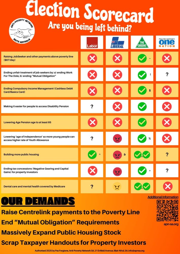 For this year’s Federal Election on 3 May 2025, we have a full scorecard as well as some mini-scorecards below, on some of our priority demands (our priority demands are listed in our Federal Election flier).