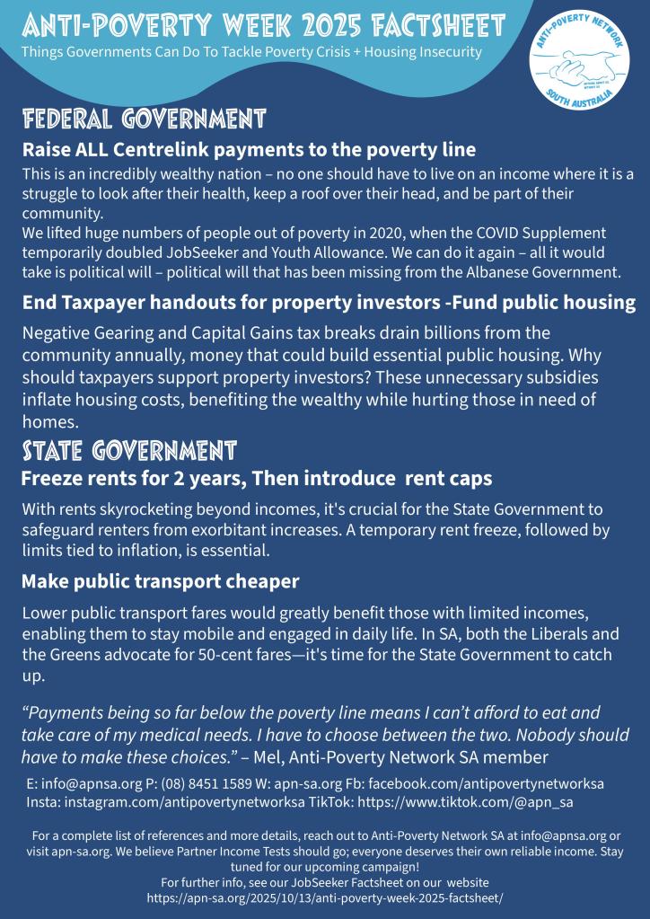 This factsheet was produced by Anti-Poverty Network SA, a grassroots community advocacy organisation led by people directly affected by the poverty crisis and the housing crisis.