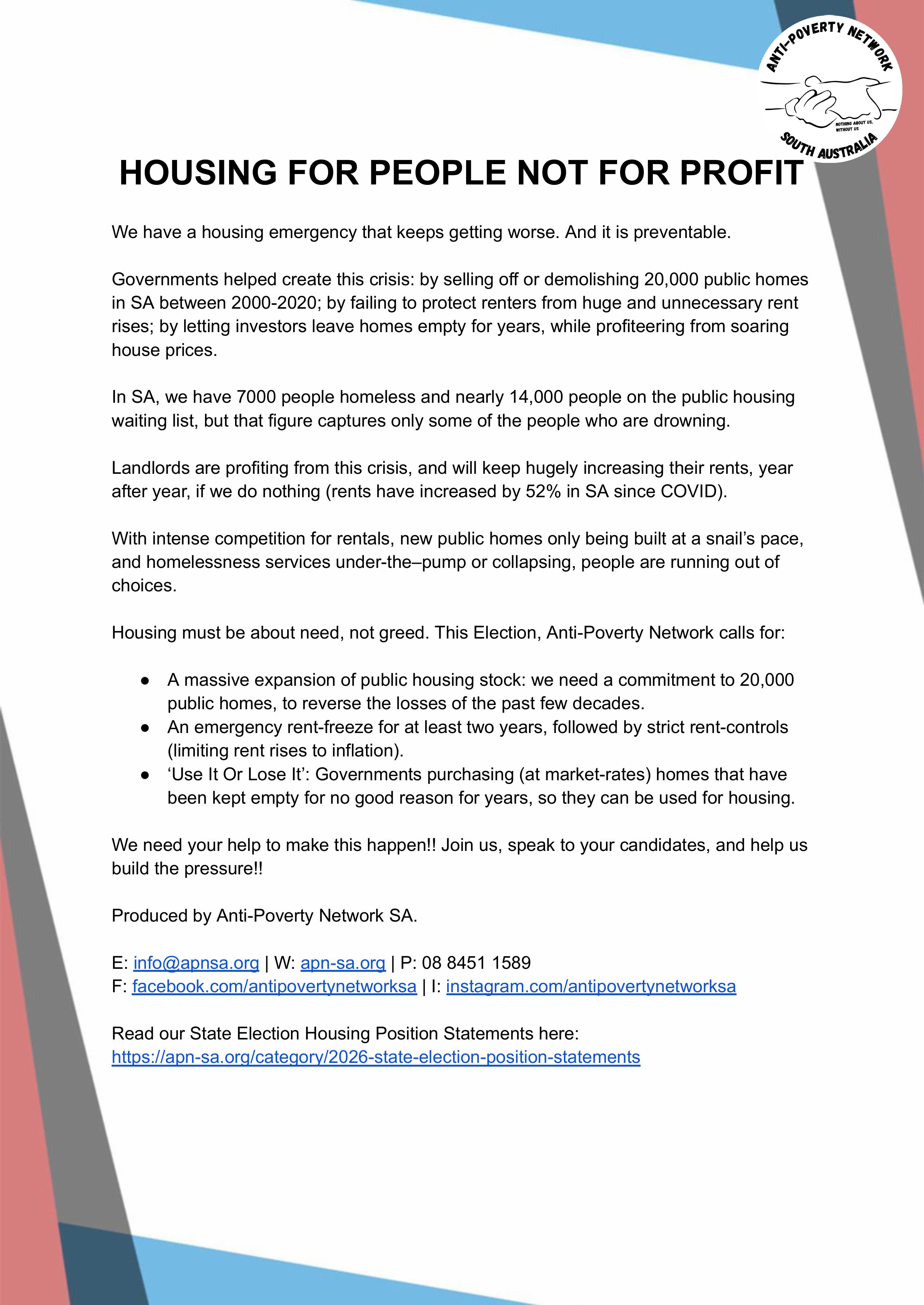 Anti-Poverty Network SA is calling for all parties and candidates across the state to commit to urgent action on the housing crisis, as part of its 2026 State Election Campaign.