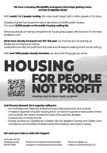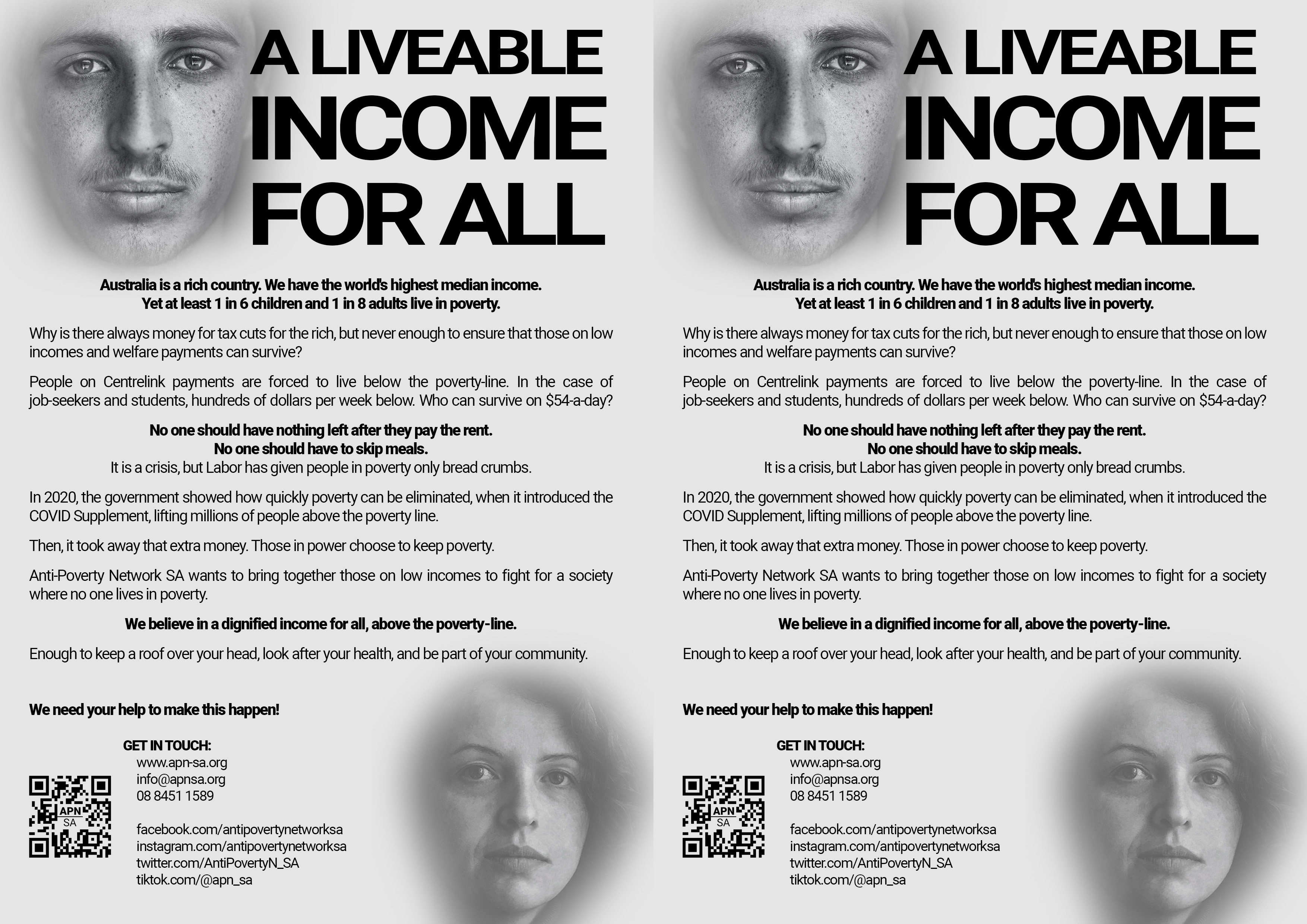 « Resources « Media & Policy Documents « Flyers & Pamphlets INTRODUCING ANTI-POVERTY NETWORK SA Introducing APN SA 2023 (Simplified) (jpg)Introducing APN SA 2023 (Detailed) (jpg) OTHER FLYERS DOWNLOAD Single A4 (Portrait) (jpg)Dual A5 (A4 Landscape) (jpg)(Updated 01/05/2024) DOWNLOAD Single A4 (Portrait) (jpg)Dual A5 (Landscape) (jpg)Updated 01/05/2024 Why Workers Should Support the Unemployed (pdf) LGBTQIA+ Poverty and Housing Vulnerability (jpg) Yes, We Can Afford It (jpg) July 7, 2024